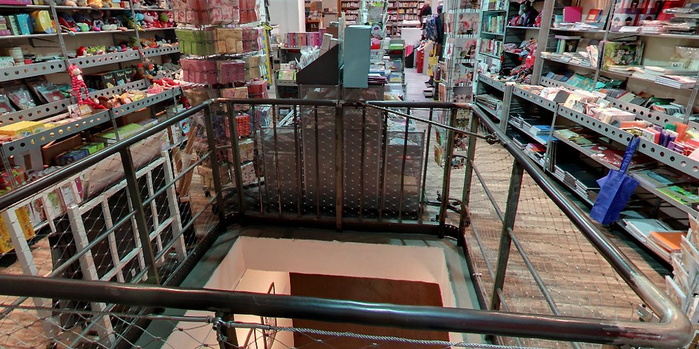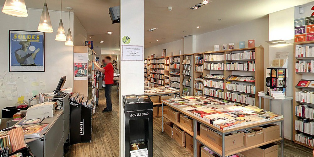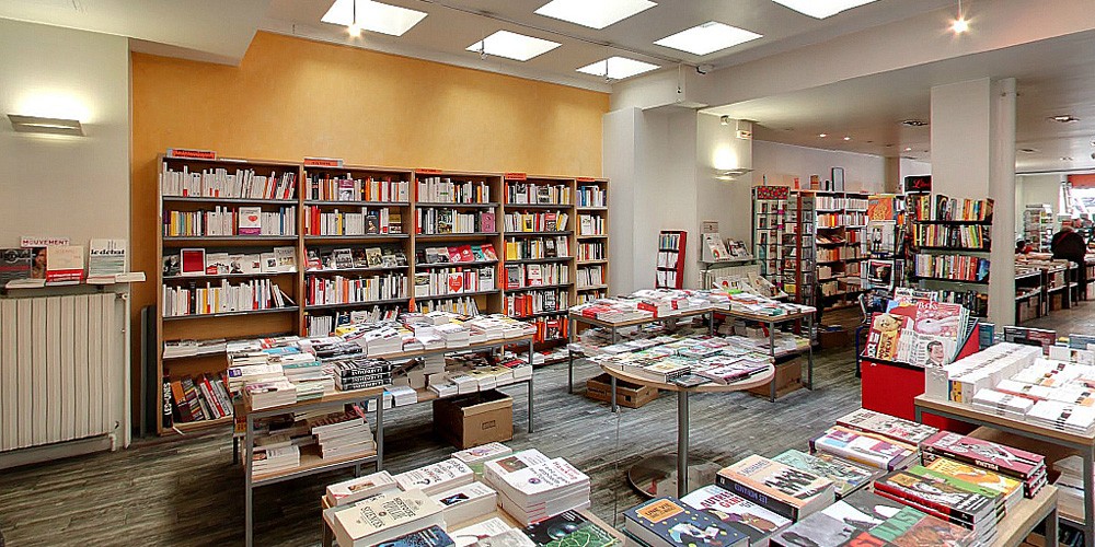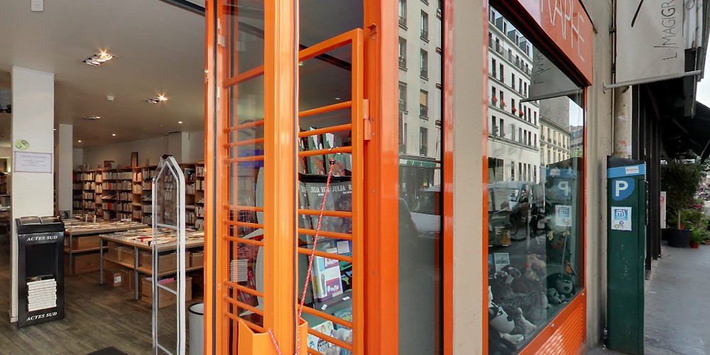 La librairie est installée dans un ancien atelier–garage, dans lequel les traces de l’activité industrielle ont été conservées : les portes de métal, la trémie et la rampe en métal, avec un accès à la lumière naturelle; une architecture spécifique qui font de cette librairie de 300 m2 un lieu original et spacieux.